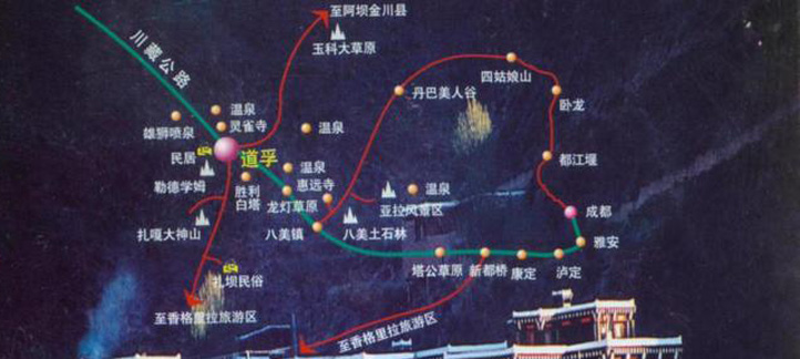 成都、映秀、臥龍、巴郎山、日隆、四姑娘山、丹巴、八美、道孚、爐霍、色達(dá)、色達(dá)佛