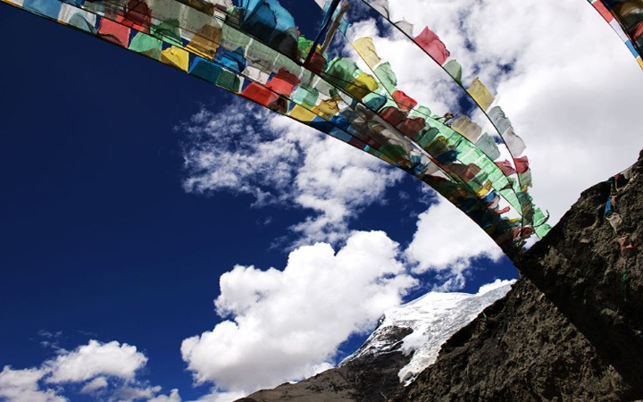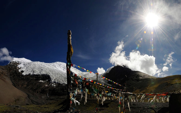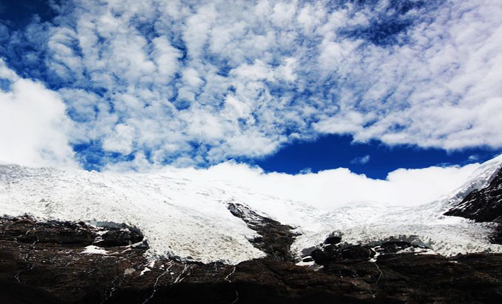 位于西藏浪卡子縣與江孜縣的交界處,乃欽康桑峰南坡,距江孜縣城75公里,為年楚河源頭之一。冰川上部為一坡度較緩的冰帽,下部為兩個呈懸冰川形式的冰舌。東冰舌長3公里,寬750米,冰舌末端高5233米;西冰舌長4.5公里,寬1.5公里,冰舌末端高5145米。整個冰川面積為9.4平方公里。冰川前緣由于基巖山丘起伏,促使冰舌前緣緩慢移動的冰層頂部發(fā)生張裂。冰雪沿冰層張裂消融,形成壯麗多姿的冰塔林。在冰塔林上由于雪塵相間顯示出各種云卷狀的奇異褶曲,猶如能工巧匠精心細雕的花紋圖案。在冰舌前緣的基巖冰蝕臺地上可見數(shù)條長達10余米、寬10-20厘米、深8-10厘米的楔型刮痕平行分布,這是其它冰川罕見的跡象,形如"創(chuàng)床"的導(dǎo)軌,使人贊嘆大自然的魅力.