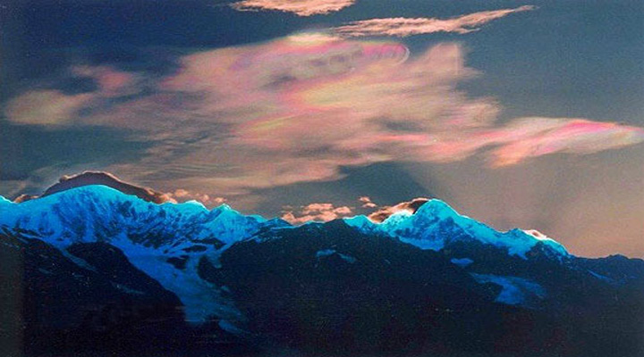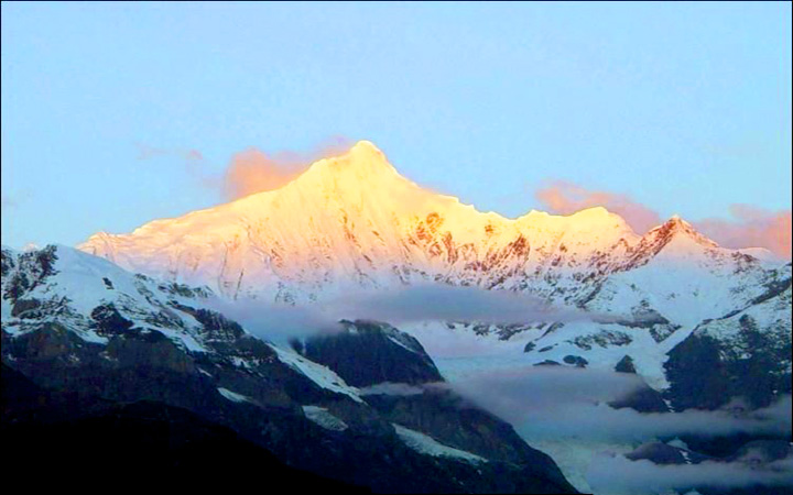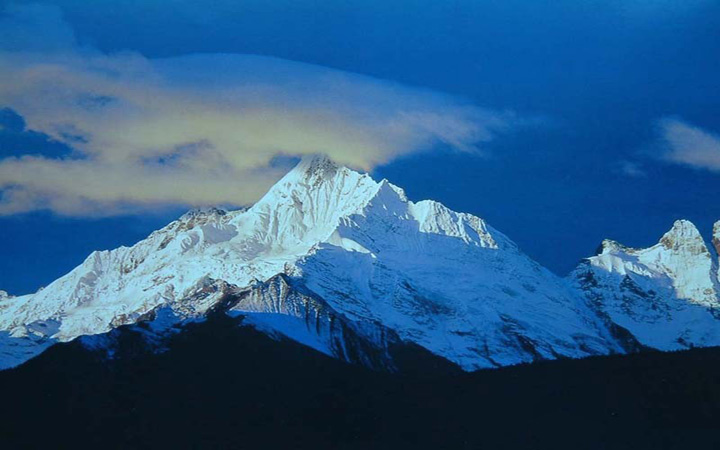 梅里雪山是云南最壯觀的雪山山群,數(shù)百里冗立綿延的雪嶺雪峰,占去德欽縣34.5%的面積。海拔6000米以上的太子十三峰,各顯其姿,又緊緊相連。主峰卡瓦格博峰海拔6740米,是云南最高的山峰。迪慶藏族人民在梅里雪山腳下留下了世世代代的生存痕跡,也將深厚的文化意蘊(yùn)賦予了梅里雪山。從州府中甸乘車至德欽縣城,再往城東行數(shù)公里,就到了飛來寺。此時(shí),作為梅里雪山主體雪蜂的太子十三蜂,就展現(xiàn)在視野里。若巧逢天氣晴朗,那清遠(yuǎn)澄凈的藍(lán)天,映襯著高潔雄奇的雪峰,卡瓦格博峰白色的鋒芒直指蒼宮。其左右排列的各個(gè)雪峰,都仿佛受其制約著,又仿佛是其摩下的不可分離的一個(gè)整體。