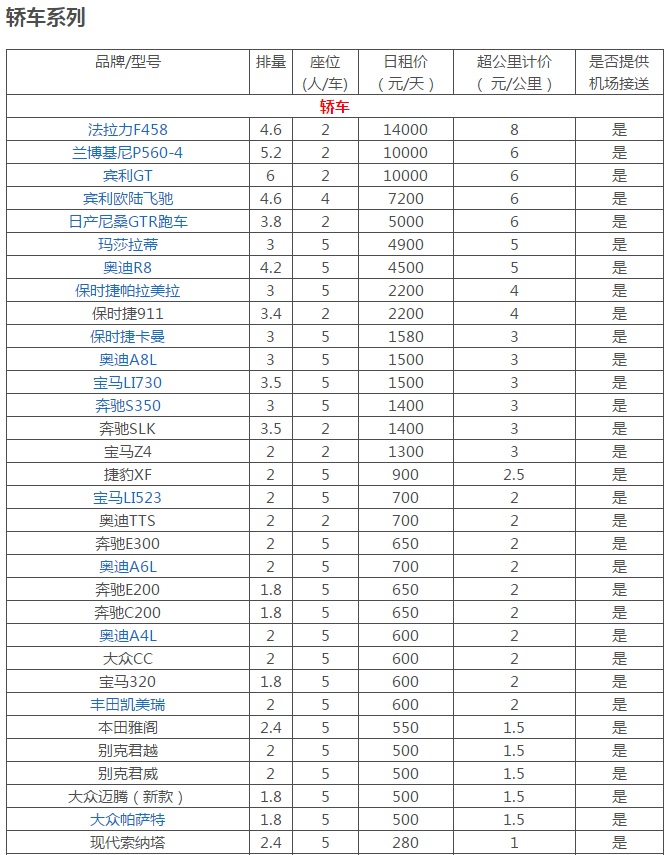 收藏好這一份成都租車價(jià)格表,可以讓你在租車的時(shí)候少走很多彎路,當(dāng)然不同的租車公司價(jià)格可能有差異,淡旺季也可能會(huì)有價(jià)差,這個(gè)都是正常的,大家還需要理性對(duì)待,這個(gè)價(jià)格表雖然比較全面但是也僅供參考,具體還要也你聯(lián)系的租車公司的價(jià)格為準(zhǔn)確價(jià)格。